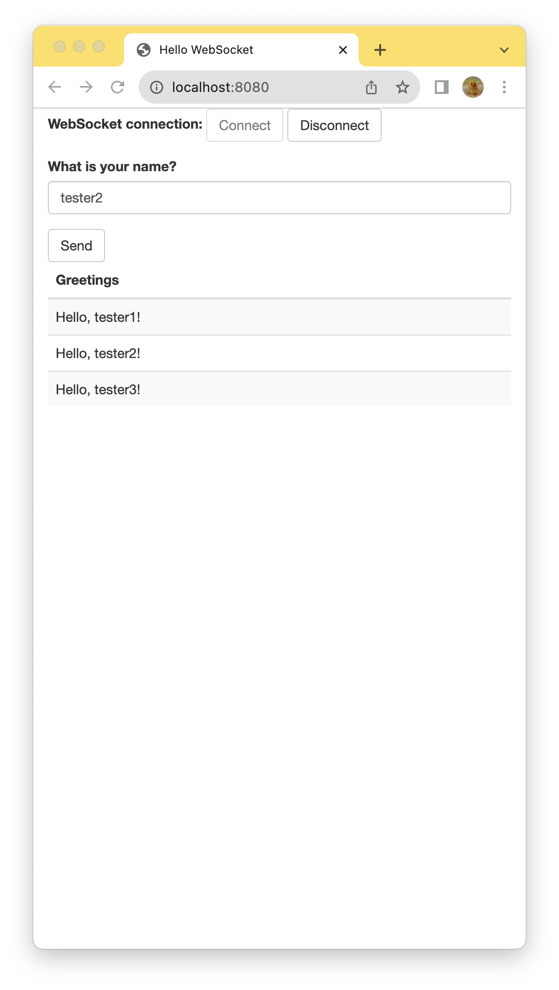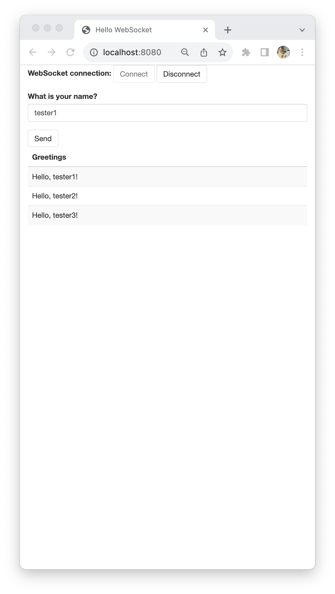 연결이 열리면 이름을 입력하라는 메시지가 표시됩니다. 이름을 입력하고 보내기를 클릭합니다. 사용자의 이름이 STOMP를 통해 서버에 JSON 메시지로 전송됩니다. 1초의 시뮬레이션 지연 후 서버가 페이지에 표시될 "Hello" 인사말과 함께 메시지를 다시 보냅니다. 이때 다른 이름을 보낼 수도 있고 연결 끊기 버튼을 클릭하여 연결을 닫을 수도 있습니다.